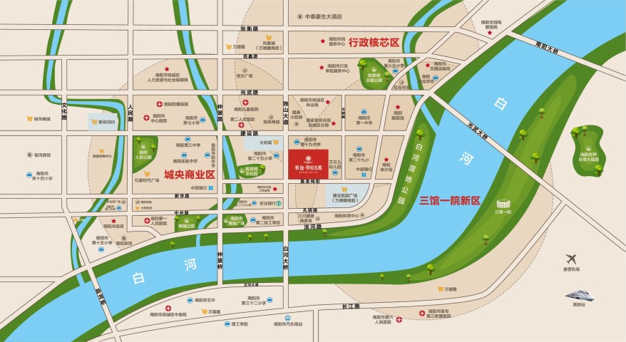 休闲配套:①南阳解放广场 ②医圣祠文化园 ③南阳体育中心 ④白河国家城市湿地公园 ⑤南阳规划展示馆